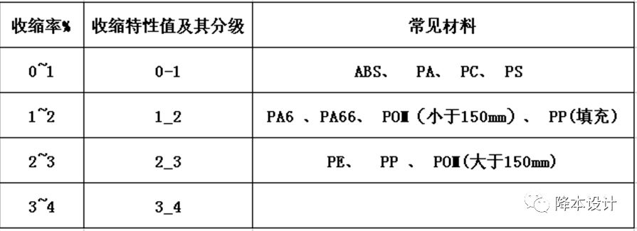 收缩0~1%的常用材料有:ABS,PC,PC/ABS,PA+玻纤填充物,PP+填料