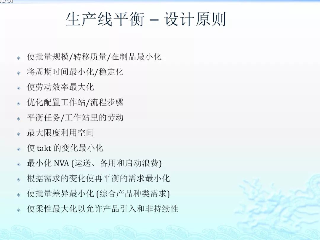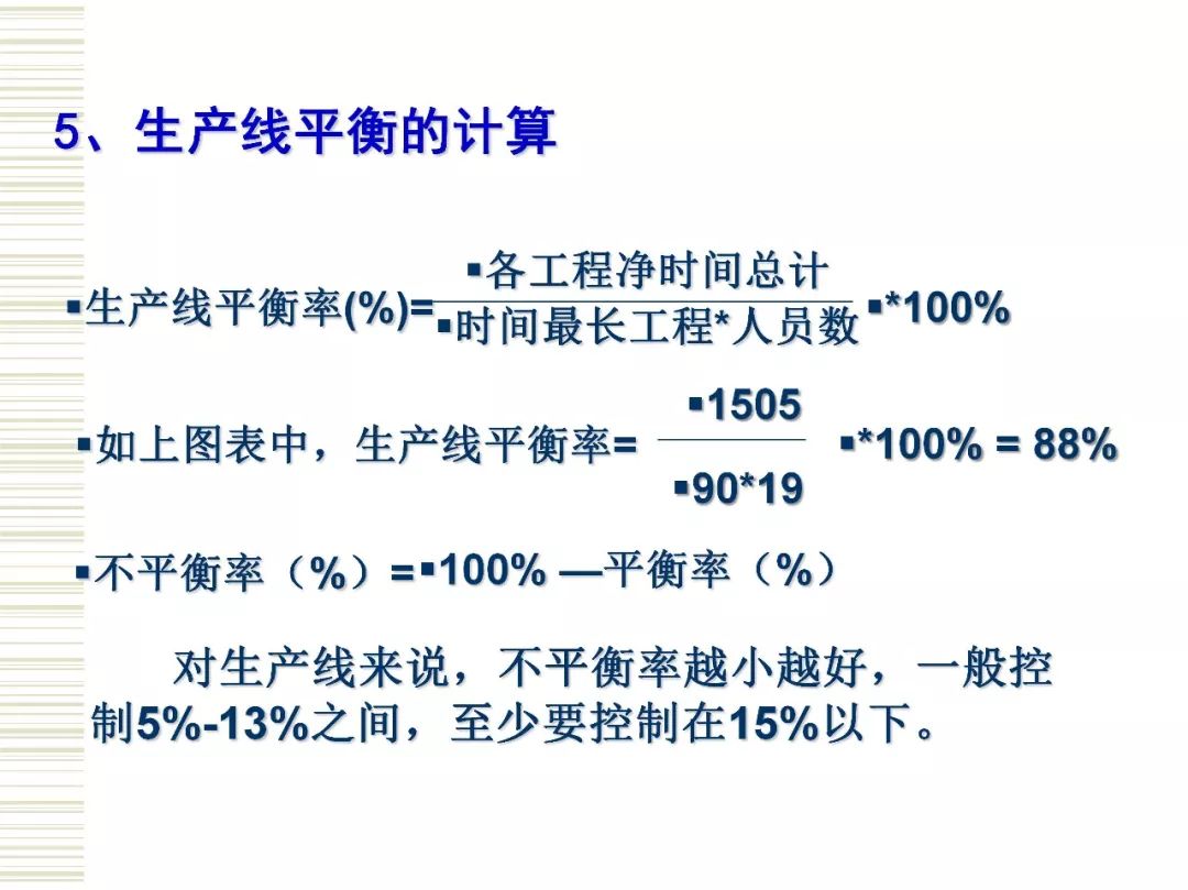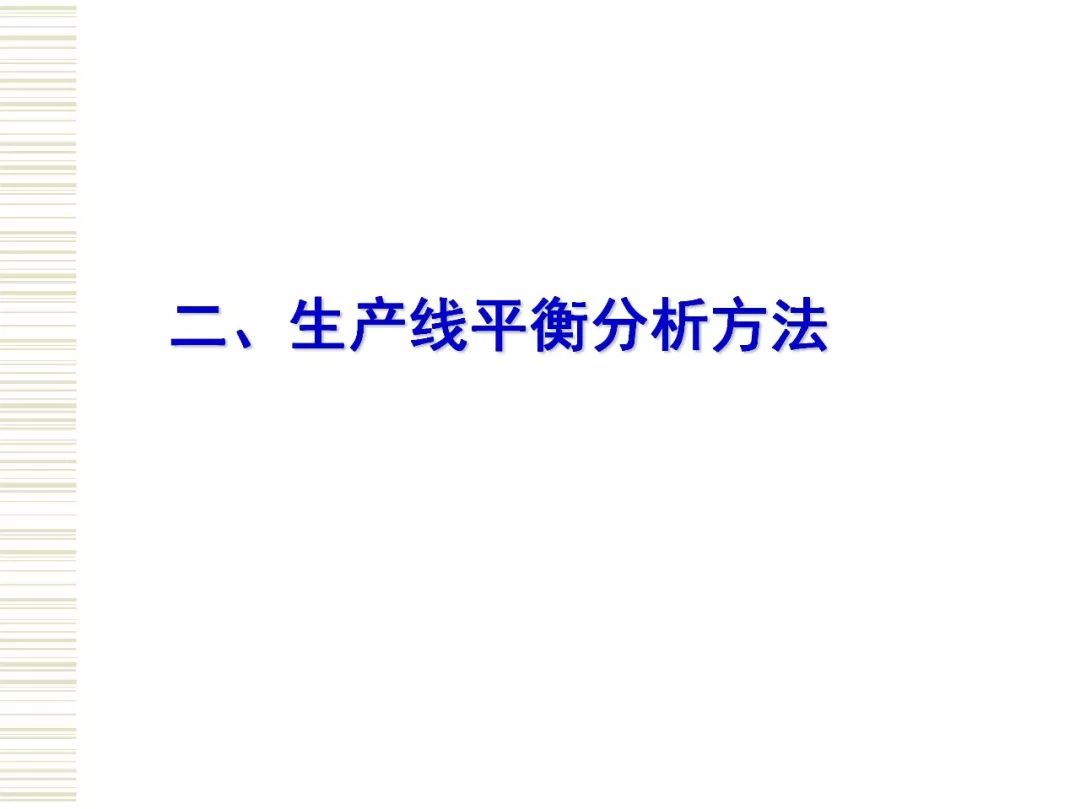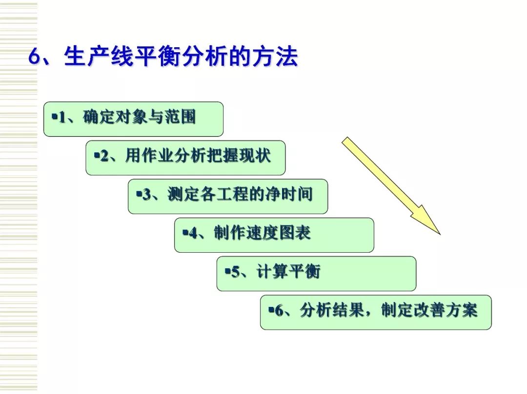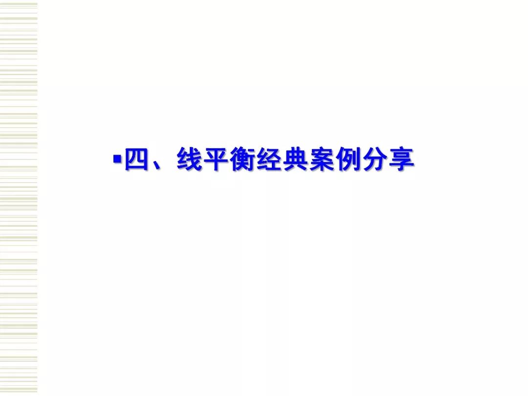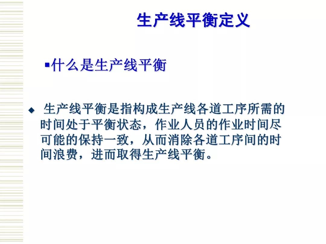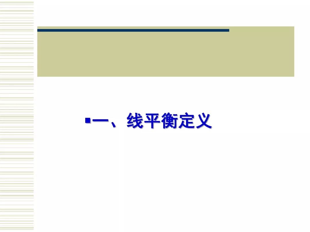 生产线平衡(Production Line Balance)即是对生产的全部工序进行平均化,调整作业负荷,以使各作业时间尽可能相近的技术手段与方法。目的是消除作业间不平衡的效率损失以及生产过剩。 生产线平衡是一门很大的学问,生产线平衡直接关系到生产线的正常使用。生产线平衡指南主要包括生产线平衡的相关定义、生产线平衡的意义、工艺平衡率的计算、生产线平衡的改善原则和方法。