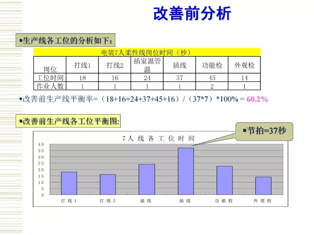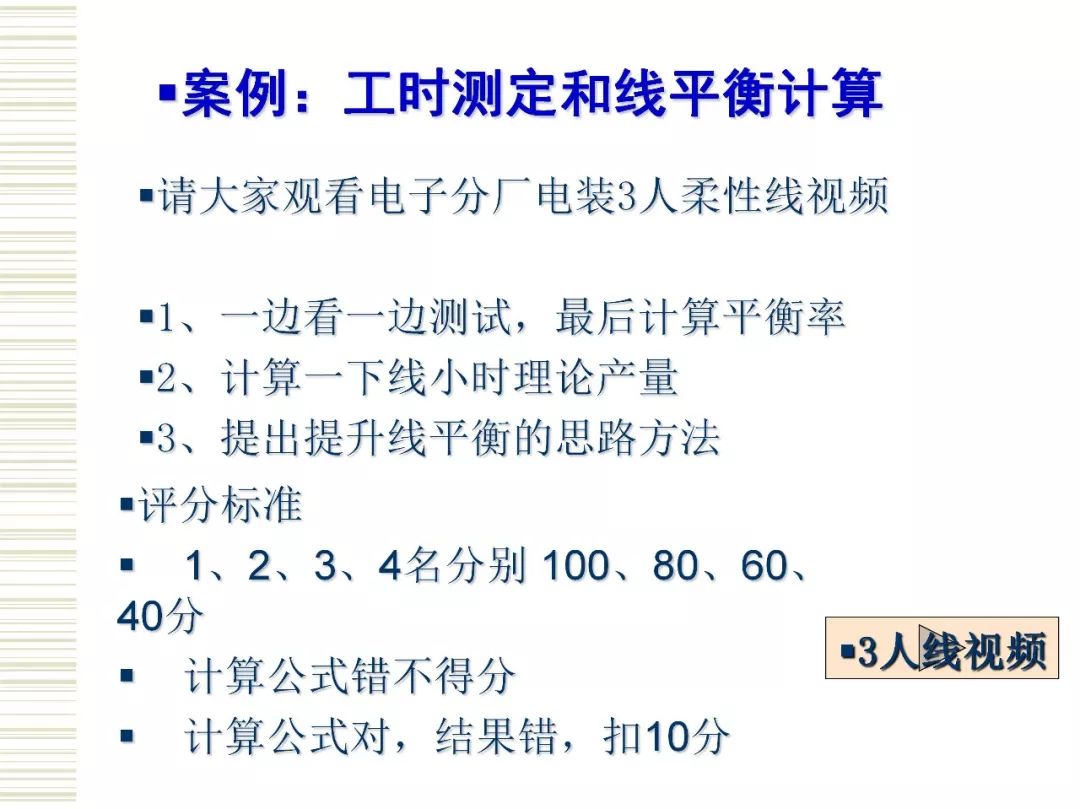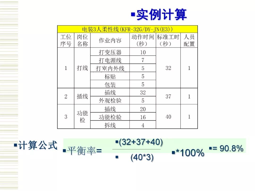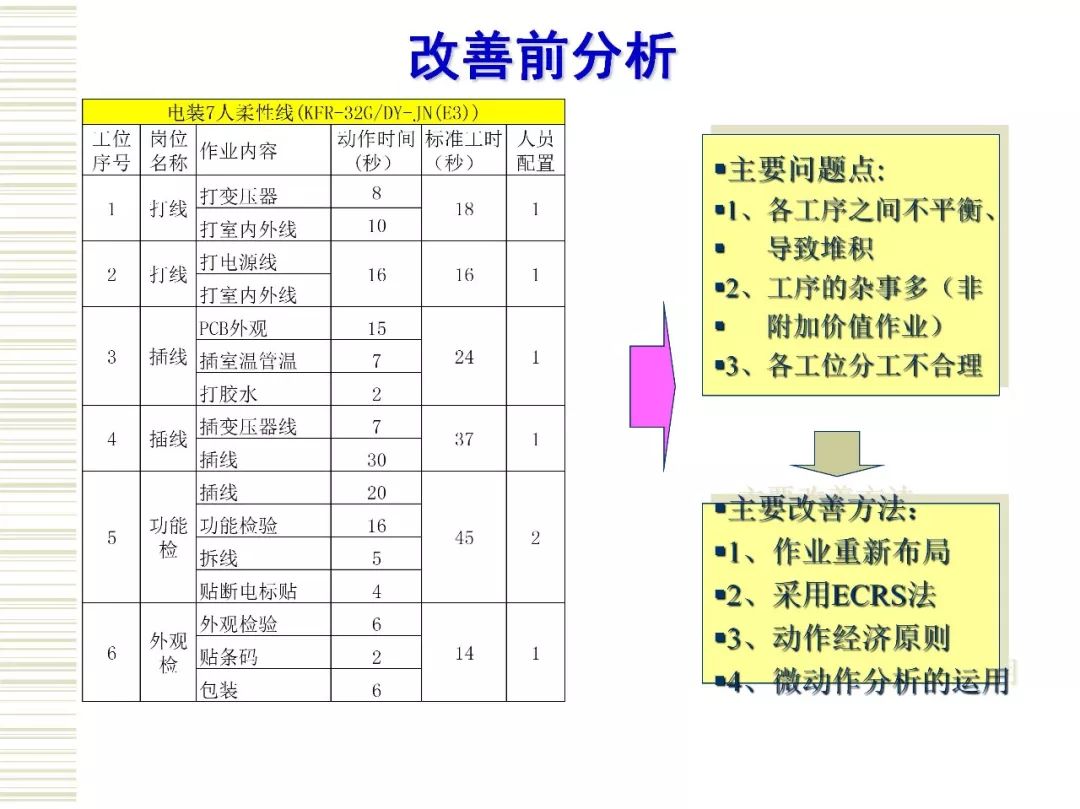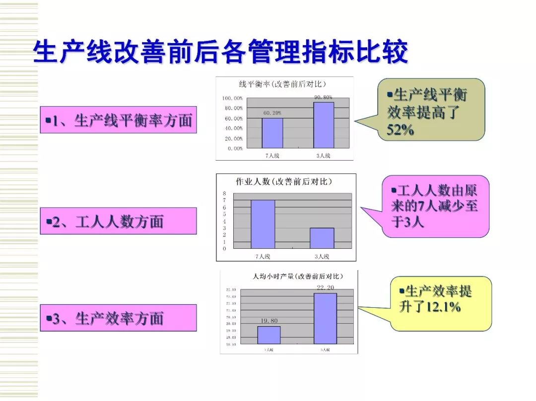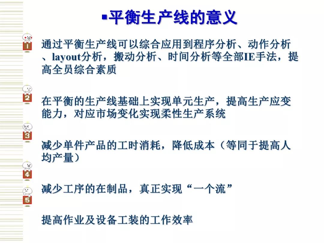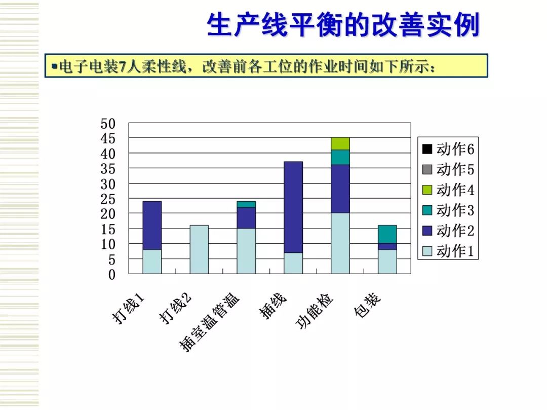生产线平衡是实现精益生产的一个重要方面。 运用IE法则,对生产线进行分析,提高生产效率,是目前精益生产管理中有效的方法。生产平衡注重系统的整体效率而非系统个别环节的效率,生产的不平衡只能造成浪费。对于制造企业而言,生产线平衡是高效生产的核心。制造工厂想要解决生产线不平衡问题,首先,需要对生产线生产工时进行测定,计算出生产节拍,最少工位数,根据可靠数据绘制出作业顺序图,找出瓶颈工序位置,得出平衡率来判断生产线的平衡程度。然后,在生产线平衡排程规则中,从5M入手对制造过程的作业工序进行调整,作业方法进行改善,以达到分到各工位的作业时间大致相等,使得生产线上的闲置时间最少,提高工人和设备的利用率,生产线上各活动同步进行从而实现工人和设备的最大利用,工作流十分流畅的目标。