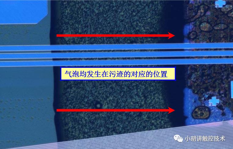 从以上图片表现,此类气泡基本上发生在LCD有污迹的地方,造成的原因如下: